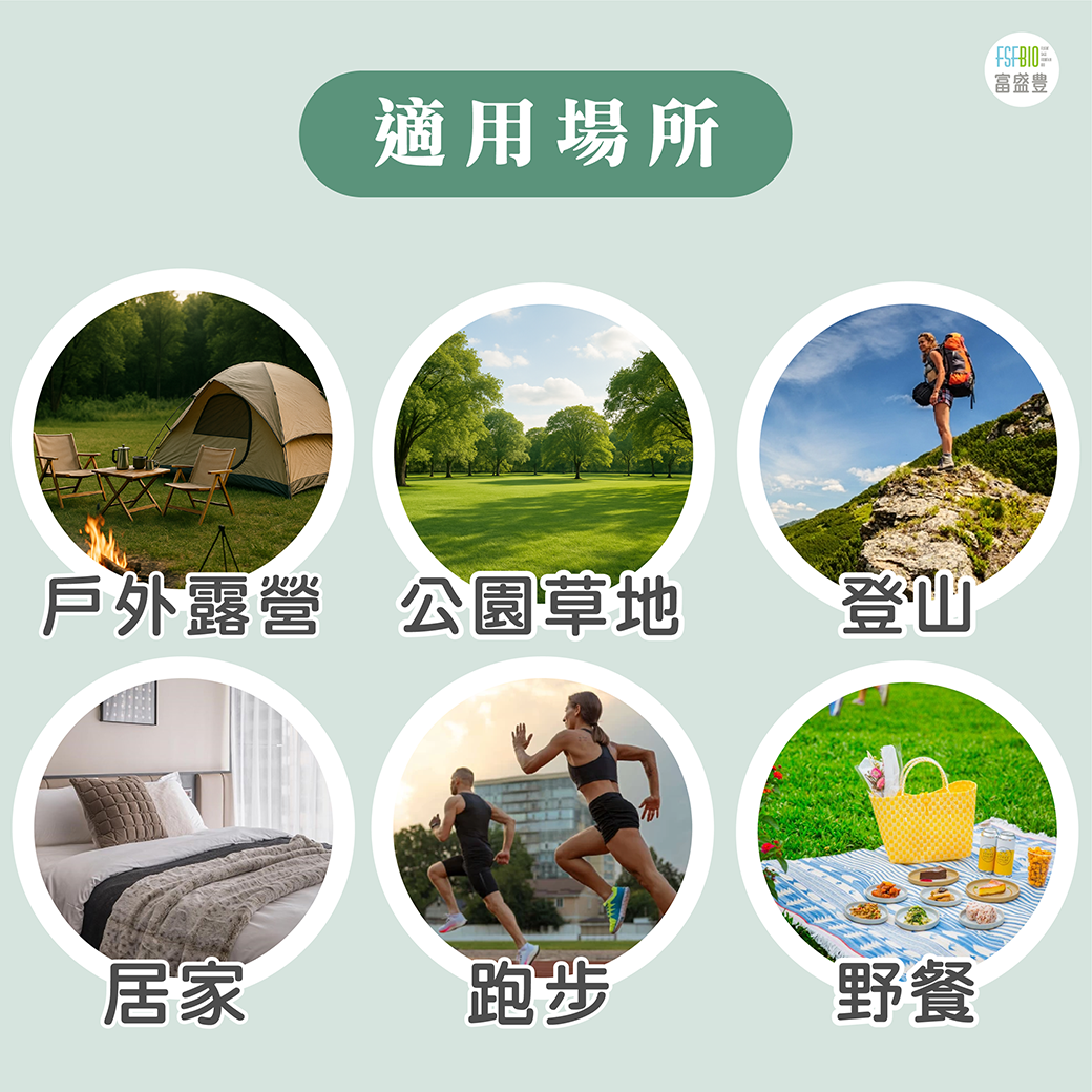 可噴於手腳、頸部、手臂等外露肌膚部位,適用於日常戶外活動時防護使用,如登山、露營、公園散步等,如有流汗擦拭後可適度補噴。